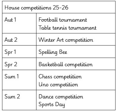 Inter house competitions are held every half term. The House events calendar is planned out for the year and the children enjoy taking part in, as well as supporting the various competitions on offer.